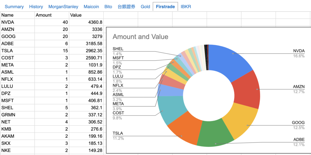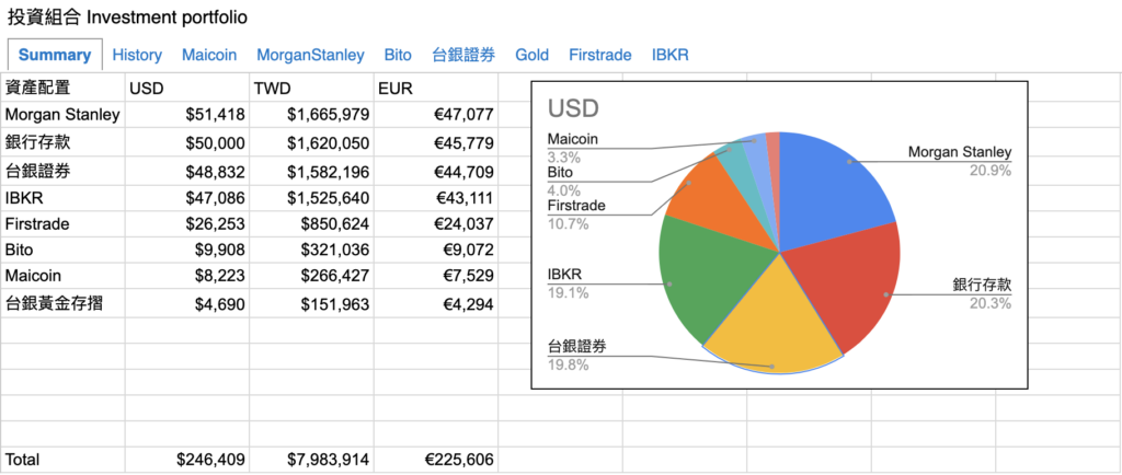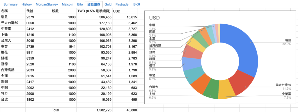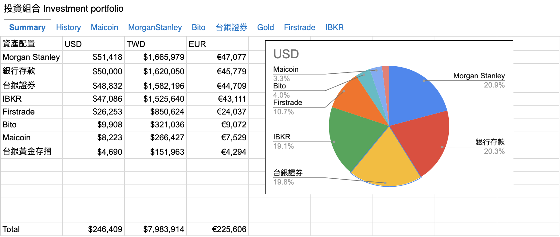 目前這個表中有各家交易平台佔總體資產的比例,以及目前總額淨值。為了方便查看幣別我也順手列出三種幣別的換算。舉例來說,目前此表中的資產換成台幣大約是 798 萬。